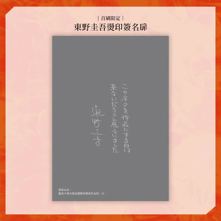 東野圭吾向來擅長讓角色具有高度帶入感,五代在調查中所做的每一個決策、每一次猶疑,總是忠實呈現在讀者面前,讓讀者一同堆敲案情,隨著調查深入,每一條線索都像是燃燒未盡的餘灰,隱約指向某個更驚人的秘密⋯⋯
