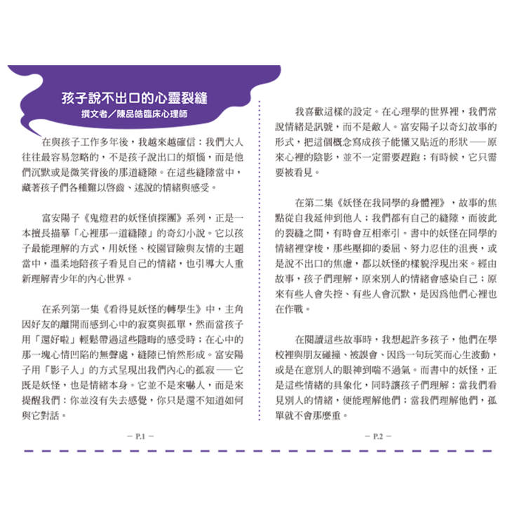 在閱讀這些故事時,我想起許多孩子,他們在學校裡與朋友碰撞、被誤會、因爲一句玩笑而心生波動,或是在意別人的眼神到喘不過氣。而書中的妖怪,正是這些情緒的具象化,同時讓孩子們理解:當我們看見別人的情緒,便能理解他們;當我們理解他們,孤單就不會那麼重。