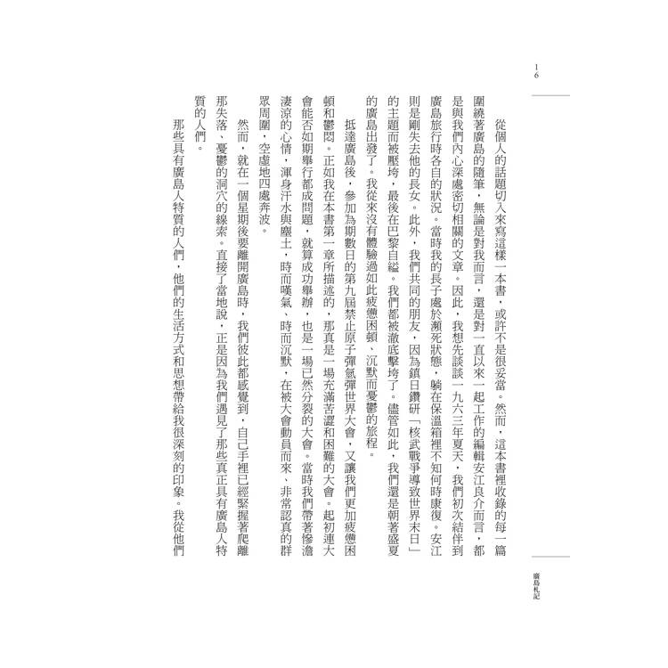 在《廣島札記》中,大江以尖銳而深沉的筆觸,刻畫了廣島人兼具「悲慘與尊嚴」的身影,並以此為出發點,對於戰爭、原爆、核危機、人性的本質進行了椎心刻骨的探索。二戰80週年的此刻,繁體中文版終於問世。