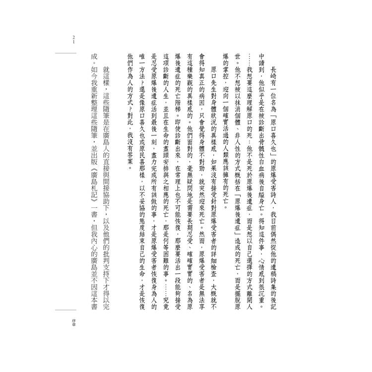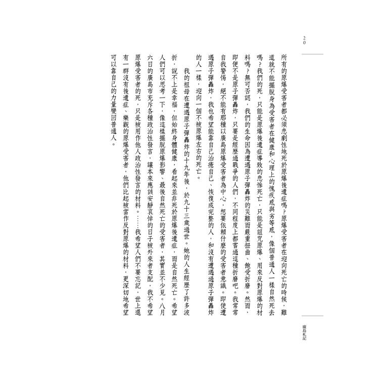 這位青年,是在四歲那年夏天遭到原子彈轟炸。我們看過無數在原子彈降臨廣島那天受傷的孩童照片。小西信子是製作《廣島之河》的廣島母親們之一,她將這些受傷的孩子們稱為「腐爛地藏」,如此為數眾多的重傷孩童照片,實際上在我們的歷史中也不會一再出現吧。那些帶著不可思議的寧靜表情的孩子們,泰半都在被拍下照片後數日內死亡,勉強活下來的一位孩子,在進入青少年時期後半時發現自己罹患白血病。青年就在原爆醫院的病床上,迎接他的二十歲。