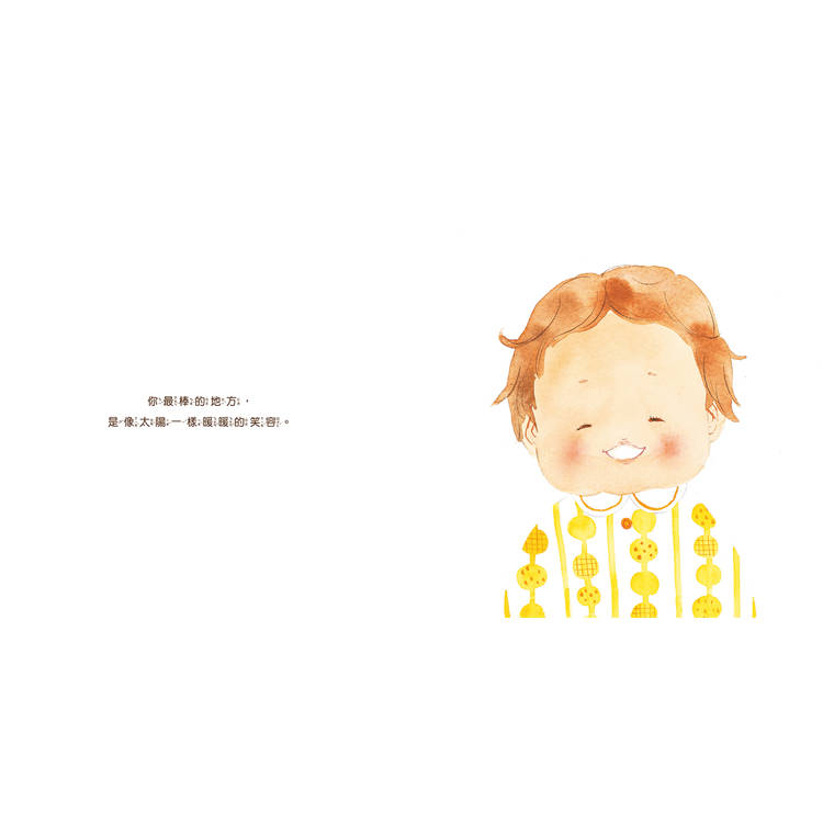 「你最棒的地方,是什麼呢?」從第一頁到最後一頁,書中小男孩的臉上總是洋溢著幸福快樂,顯然他完全接收到了父母的愛。從小被如此教養的孩子,無論遇到什麼困難,我想他們都能自信快樂的去面對。雖然這是以兒童為主角的圖畫書,但更值得父母仔細閱讀。