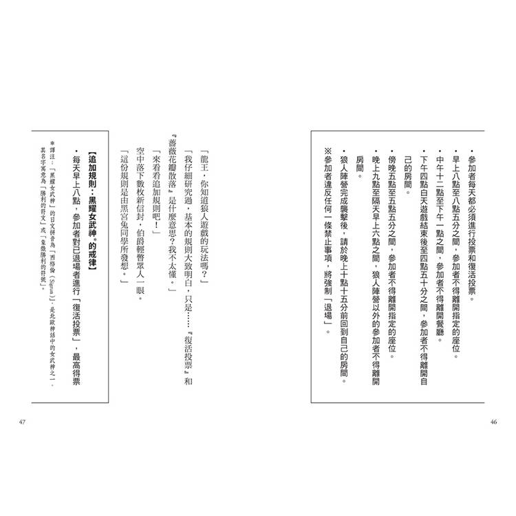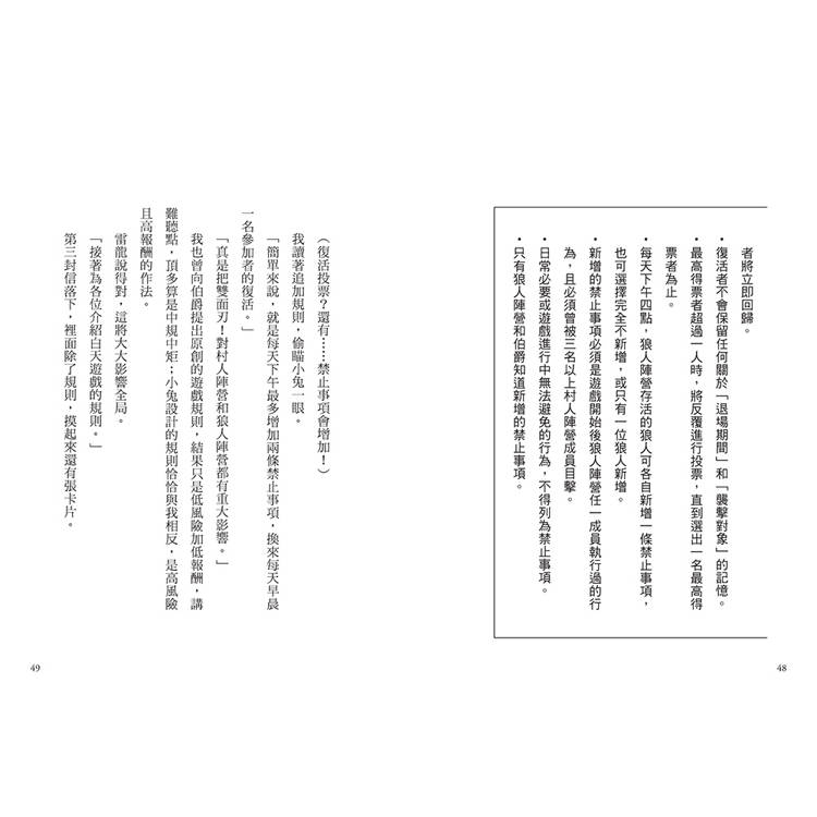 如果就情節來說,書中一次又一次狼人吞噬參賽者,有點「兒童不宜」,但是別擔心,一定要看到最後呵!故事結合「狼人遊戲」的規則,要從中找到狼人,所有被困住的人才能得救。讀者一邊讀,一定會跟著角色一起加入遊戲,並且試著從一段段對話,梳理出誰是「狼人」。燒腦的推理過程、縝密的邏輯推敲,以及最後讓人讚嘆的結局,非常期待這系列的新作品。──鄒敦怜(兒童文學作家、龍傳文創顧問)