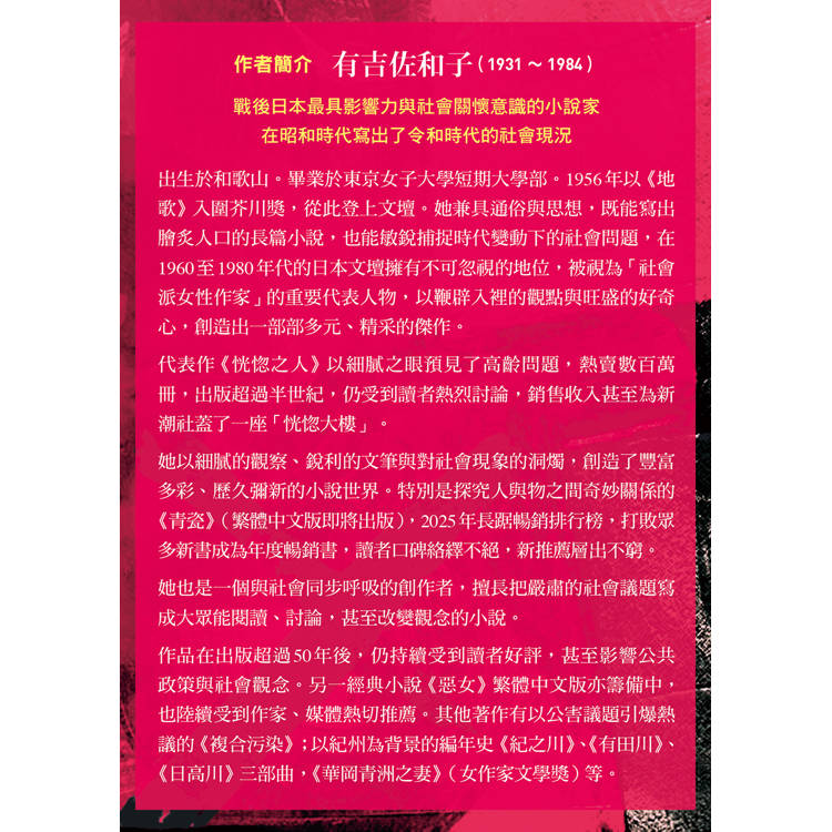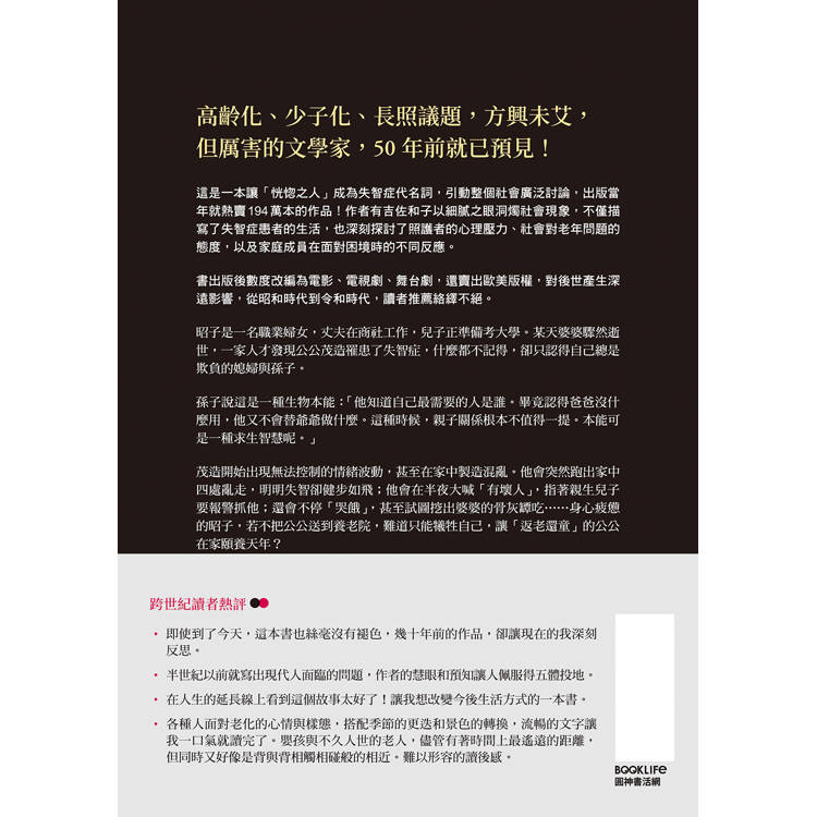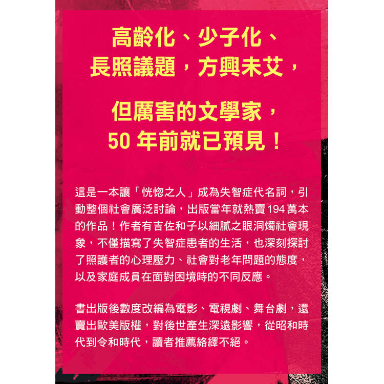 這是一本讓「恍惚之人」成為失智症代名詞,引動整個社會廣泛討論,出版當年就熱賣194萬本的作品!作者有吉佐和子以細膩之眼洞燭社會現象,不僅描寫了失智症患者的生活,也深刻探討了照護者的心理壓力、社會對老年問題的態度,以及家庭成員在面對困境時的不同反應。書出版後數度改編為電影、電視劇,還賣出歐美版權,對後世產生深遠影響,從昭和時代到令和時代,讀者推薦絡繹不絕。