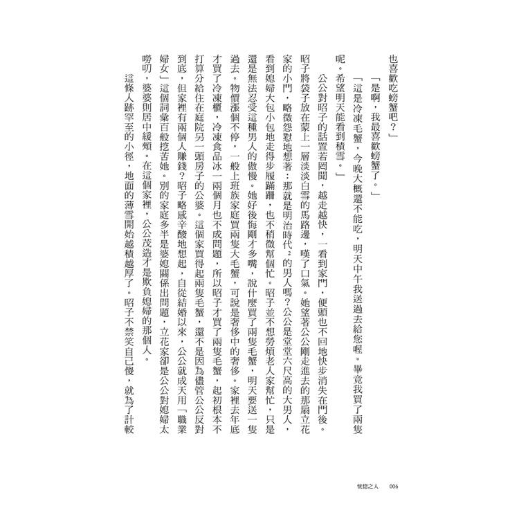 公公對昭子的話置若罔聞,越走越快,一看到家門,便頭也不回地快步消失在門後。昭子將袋子放在蒙上一層淡淡白雪的馬路邊,嘆了口氣。她望著公公剛走進去那扇立花家的小門,略微怨懟地想著:那就是明治時代(註:明治時期為一八六八年十月二十三日~一九一二年七月三十日之間。)的男人嗎?公公是堂堂六尺高的大男人,看到媳婦大包小包地走得步履蹣跚,也不稍微幫個忙。昭子並不想要勞煩老人家幫忙,只是,她還是無法忍受這種男人的傲慢。她好後悔剛才多嘴,說什麼買了兩隻毛蟹,明天要送一隻過去。物價漲個不停,一般上班族家庭買兩隻大毛蟹,可說是奢侈中的奢侈。家裡去年底才買了冷凍櫃,冷凍食品冰個一、兩個月也不成問題,所以昭子才買兩隻毛蟹,她起初根本不打算分給住在庭院另一頭房子的公婆。這個家買得起兩隻毛蟹,還不是因為家裡有兩個人賺錢(儘管公公反對到底)?昭子略感辛酸地想起,自從結婚以來,公公就成天用「職業婦女*」這個老詞彙百般挖苦。別的家庭多半是婆媳關係出問題,立花家卻是公公對媳婦太嘮叨,婆婆則居中緩頰。在這個家裡,公公茂造才是欺負媳婦的那個人。