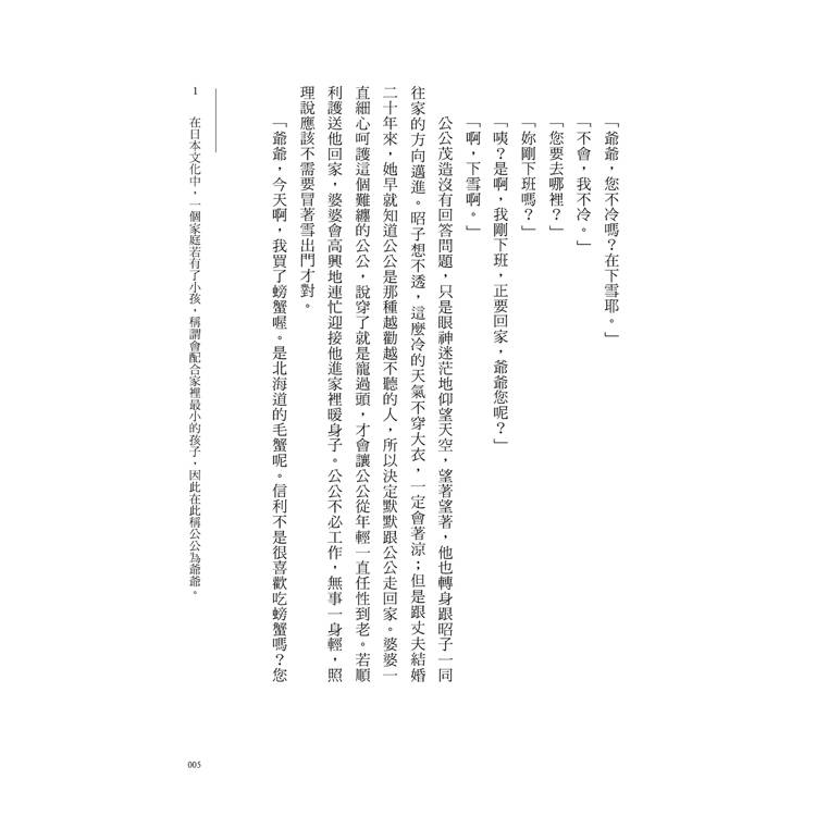 昭子打開兩隻毛蟹的包裝袋,頓時遲疑了一下,失去剛才為食材分類時的俐落。不過,她很快就回神,將一隻毛蟹放進冷凍櫃,另一隻放進冰箱。她不是捨不得將毛蟹分給公公,而是突然想起:公公茂造多年來老愛抱怨自己腸胃不好,不僅如此,昭子剛嫁進來十年,他就嫌昭子買的饅頭害他拉肚子、昭子做的紅燒魚有問題、昭子送來的魚乾害他消化不良……久而久之,昭子決定再也不將自己做的飯菜分給公公吃了。然而,為什麼偏偏忘記這點,講出那種話?還毛蟹咧。下雪天吃毛蟹,不用想也知道,公公一定會刻意跑來緣廊嚷嚷:「昭子啊,妳的毛蟹害我胃寒,我又拉肚子啦。」