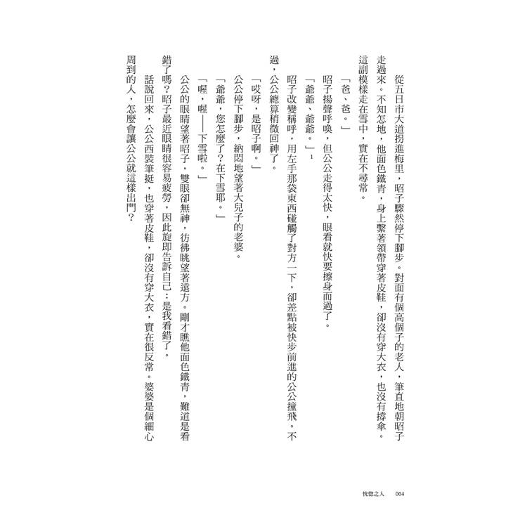 從五日市大道拐進梅里,昭子驟然停下腳步。對面有個高個子的老人,筆直地朝昭子走過來。不知怎的,他面色鐵青,身上繫著領帶穿著皮鞋,卻沒有穿大衣,也沒有撐傘。這副模樣走在雪中,實在不尋常。