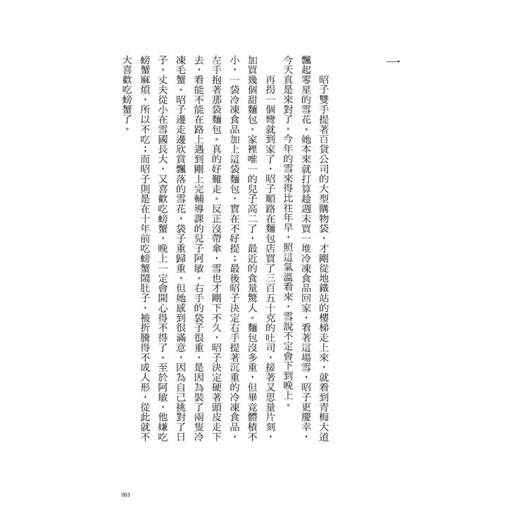 再拐一個彎就到家了,昭子順路在麵包店買了三百五十克的吐司,接著又思量片刻,加買幾個甜麵包。家裡唯一的兒子高二了,他最近的食量驚人。麵包沒多重,但畢竟體積不小,一袋冷凍食品加上這袋麵包,實在不好提;最後昭子決定右手提著沉重的冷凍食品,左手抱著那袋麵包。真的好難走。反正沒帶傘,雪也才剛下不久,昭子決定硬著頭皮走下去,看能不能在路上遇到剛上完補導課的兒子阿敏。右手的袋子很重,是因為裝了兩隻冷凍毛蟹。昭子邊走邊欣賞飄落的雪花,袋子重歸重,但她感到很滿意,因為覺得自己挑對日子了。丈夫從小在雪國長大,又喜歡吃螃蟹,晚上一定會開心得不得了。至於阿敏,他嫌吃螃蟹麻煩,所以不吃;而昭子則是在十年前吃螃蟹鬧肚子,被折騰得不成人形,從此就不大喜歡吃螃蟹了。