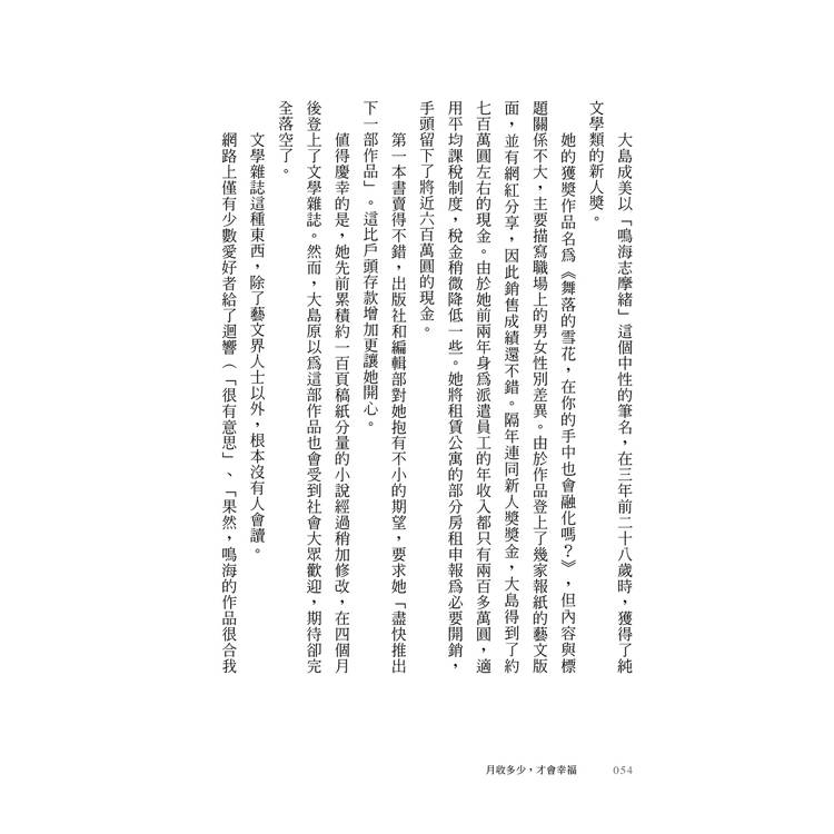 大島沉吟一聲,陷入思考。她不是那種才華洋溢、橫掃大獎的作家,卻也不是會大賣的暢銷作家。既然如此,她該怎麼以小說家的身分繼續生活下去呢?她很難把這樣的掙扎用言語表達出來。