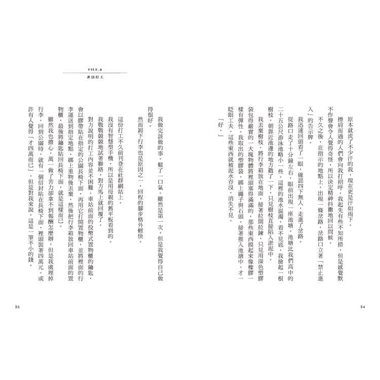 雖然我也擔心,萬一做了苦力卻拿不到報酬怎麼辦,但是我處理掉行李,回到公園時,就有一個信封貼在長椅下面,裡頭裝著四萬元。或許有人覺得「才四萬而已」,但是對我來說,這是一筆不小的錢。