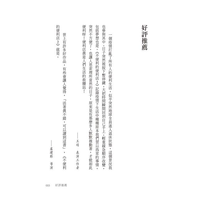 世上有許多好作品,有些會讓人覺得,「活著真不錯,可以讀到這書」,《不便利的便利店2》就是。──盧建彰  導演