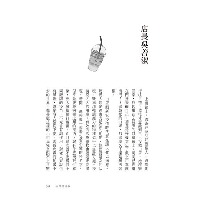 上班路上,善淑注意到好幾個人一直對她行注目禮,然後才意識到自己沒戴口罩。她趕緊回家,抓起掛在玄關旁的口罩戴上。明明已經掛在門邊提醒自己,卻還是好幾次忘了戴上口罩就出門……這該死的口罩,都這麼久了還是無法習慣。 口罩跟新冠疫情時代實在讓人難以適應。聽說人類是適應力超強的動物,但面對這次的狀況,號稱超強適應力的物種似乎也無計可施。疫苗沒太大的用處,有效的治療藥物也遲遲未能出現。新聞一直報導一些看也看不懂的怪名字,似乎是變異病毒之類的東西,說有什麼突破性感染,要大家繼續打疫苗。