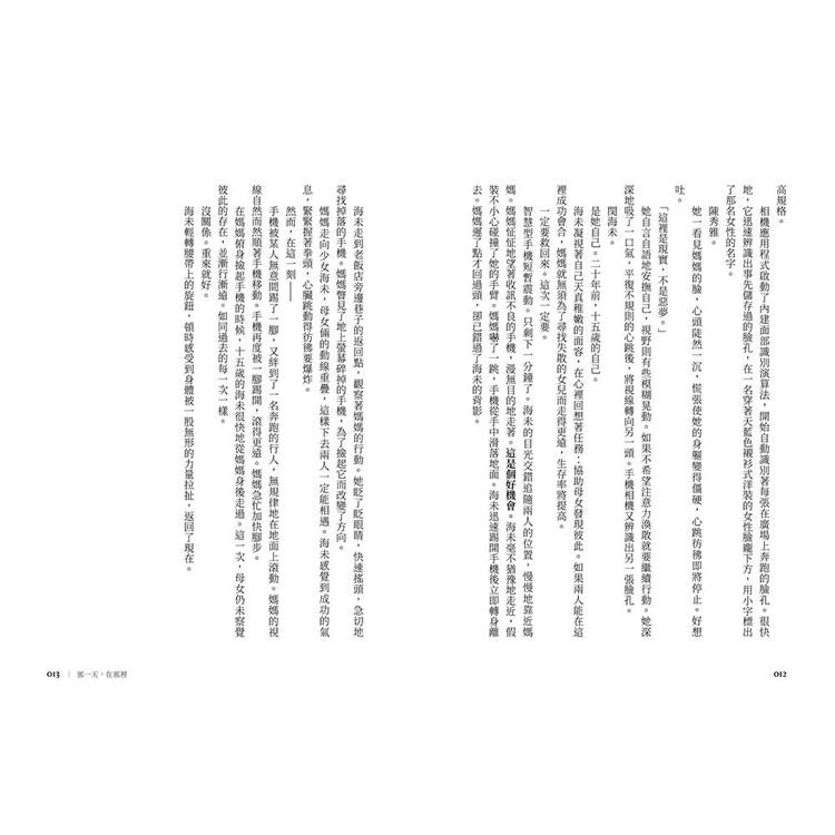她自言自語地安撫自己,視野則有些模糊晃動。如果不希望注意力渙散就要繼續行動。她深深地吸了一口氣,平復不規則的心跳後,將視線轉向另一頭。手機相機又辨識出另一張臉孔。