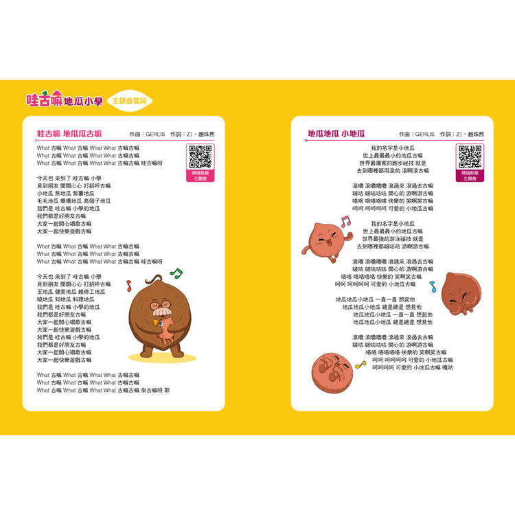 本書收錄系列主題曲〈哇古嘛 地瓜瓜古嘛〉與該集主題曲〈地瓜地瓜 小地瓜〉兩首歌曲,以動感的旋律與輕快的節奏,吸引孩子主動閱讀。藉由視聽結合的方式,提升孩子的閱讀興趣,同時增加學習的趣味性。