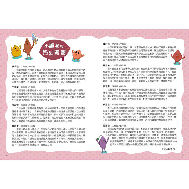 書中的角色我最喜歡小地瓜、紫薯地瓜和閃亮亮地瓜。小地瓜非常勇敢又擅長運動,遇到困難時總是第一個站出來,讓人覺得很可靠。紫薯地瓜十分厲害,能在短時間內完成一座巨大的梯子,幫助大家順利前進,真令人佩服。閃亮亮地瓜為了同學們的安全,自告奮勇先下到地下室探路,展現出關心同伴的精神。這本書內容既有趣又好笑,不知不覺就把整本書看完了。
