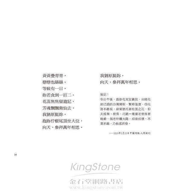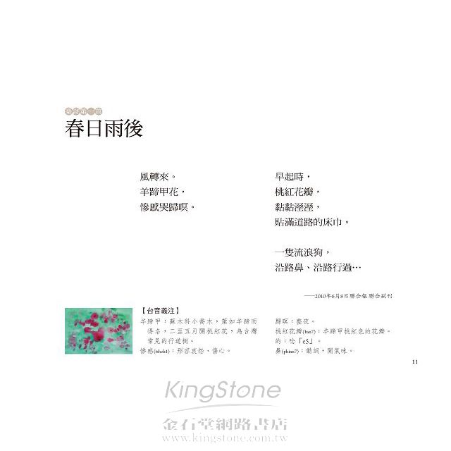現下,擺在讀者眼前的《夭壽靜的春天--臺詩十九首》台語繪本詩,皆是投稿於《中國時報》、《自由時報》、《聯合報》等三大報副刊的台語詩作選粹,而其中〈赤崁秋月〉、〈圍城〉、〈路過馬場町〉、〈夭壽靜的春天〉四首詩,更以「台語詩」的身分,罕見地獲《台灣詩選(二魚版)》、《台灣現代詩選(春暉版)》編者青睞,連續二年(2010年及2011年),如黑馬般地闖入放眼盡是華語詩人的「年度詩選」行列。這樣的遭遇,看似僥倖、突兀,但也可權充流汗播種台語文學田園,流淚收割的小小儀式。