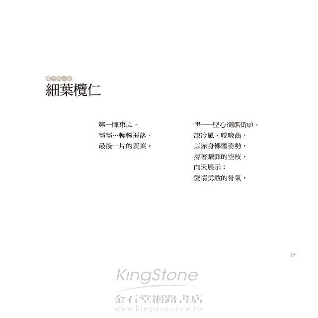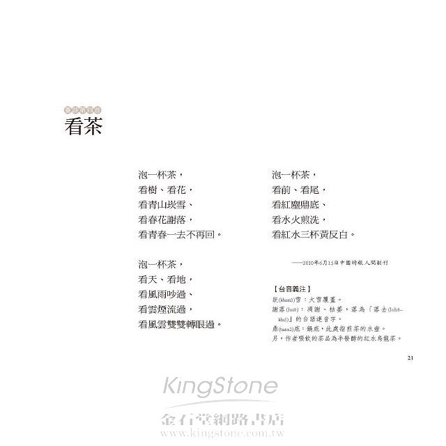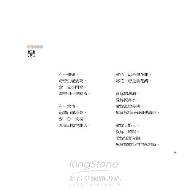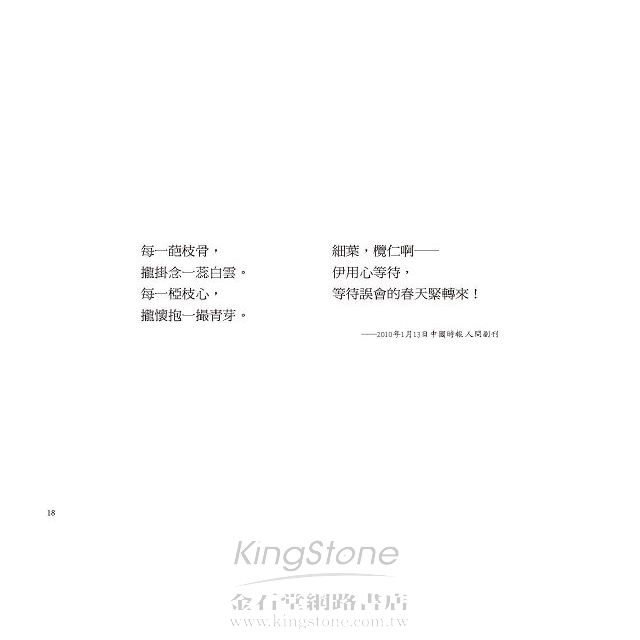 總之,這十九首詩,都是通過作者、三大報副刊主編的重重挑剔、檢驗,篇篇精挑細選,採「非常詩集」的設計規格,目的是想打破對傳統台語詩集的刻板印象,吸引人在最短時間、最輕鬆的氛圍下,走進台語文學的新世界。無論如何,這十九首台語詩,只要您喜歡、記得了其中一首,作者的心血就沒白費了。
