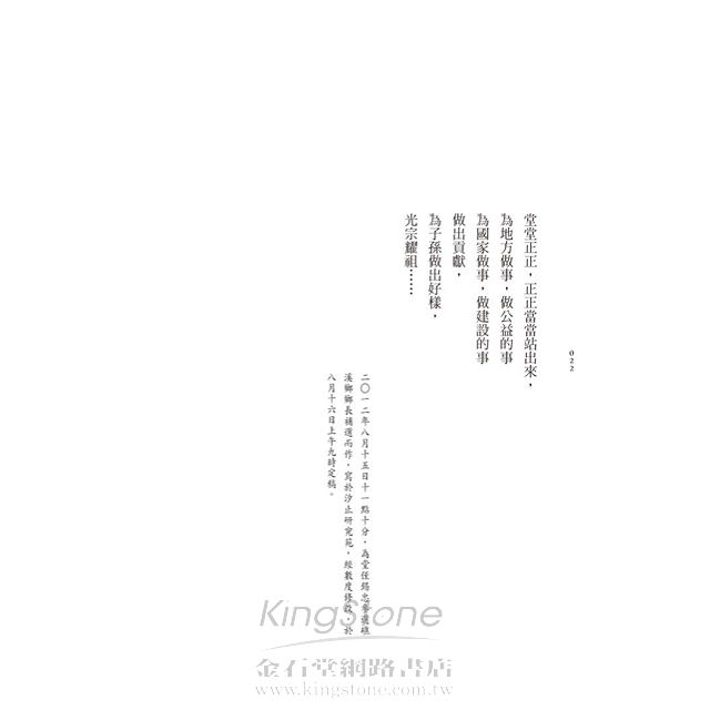 收在這集子裡的詩作,都與台灣有關,但不是我刻意要寫,我沒有想討好誰;詩是真誠的心聲,像我脈管中的血,該流出來就會自動流出來;寫詩,我有感而發,將我的感受、我的發現,一點一滴將自己內心的悸動沉澱書寫出來,與任何意識形態無關;但與血緣有關,與鄉土有關,與詩有關,與生命有關;所以,我寫我的詩。