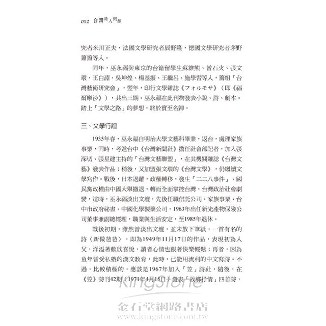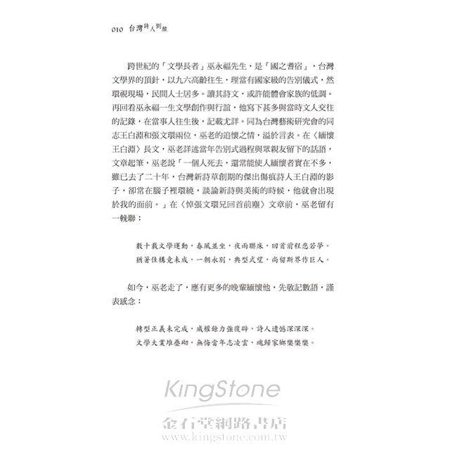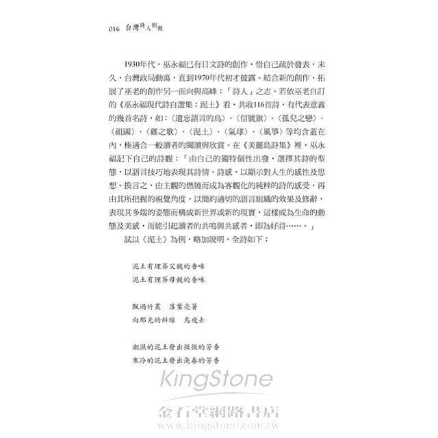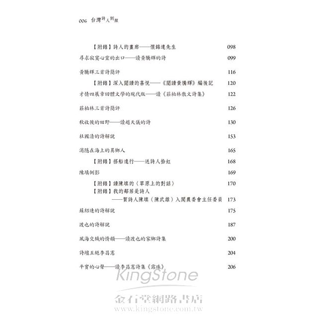 本書是《台灣詩人群像》的續篇,評論了22位台灣代表性詩人及其詩。