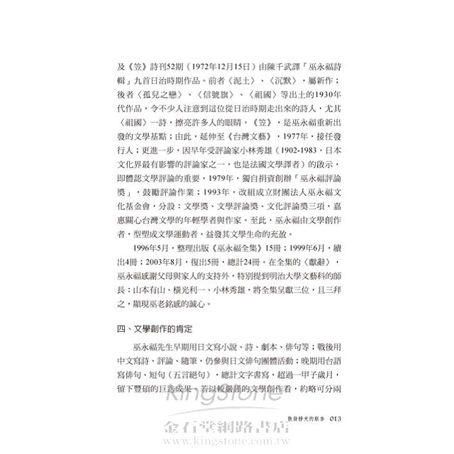 1930年代,日本殖民地出身的數位二十來歲的台灣青年,在東京籌組「台灣藝術研究會」,印行文學雜誌《フォルモサ》(即《福爾摩沙》),推動藝術性的詩文學,為新興的台灣文學界掀起里程碑。隨歲月流逝,當年英姿氣盛的一夥文藝憧憬者,逐漸凋零,跨世紀後,碩果僅存的巫永福先生也於今年9月10日離世,全體成員走入歷史,但,文學運動與文學生命並未萎謝。如同落地種子般,它們繼續在這塊土地各自萌芽、長大。文學雜誌的旗幟,仍標記著台灣新文學運動初期的有力飄揚,巫老生前整理出版全集24冊及未整理的少量文稿,都將成為豐富的文化遺產,提供典藏,讓後人欣賞與研究。塵土一坯,朝露人生,引人懷思的是這些足以千秋的詩文學。