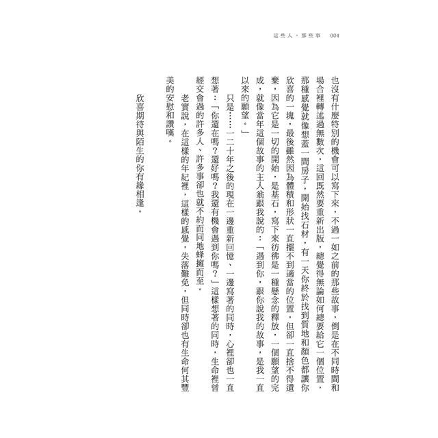 至於故事裡被我提及的所有人……我只能說:在人生的過程裡何其有幸與你們相遇,或輾轉知道你們的故事。記得年輕的時候聽過一位作家的演講,當有人問他說有沒有做筆記的習慣時,他笑著說:很少,因為我不可能隨身帶著筆紙,而且我相信,該記得不會忘記,會忘記的應該就是不重要的東西!的確如此。