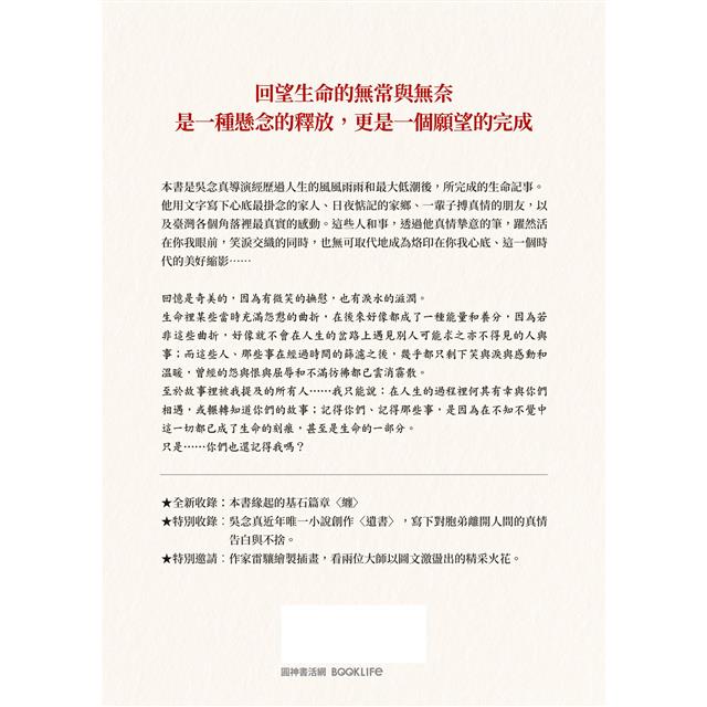 本書是吳念真導演經歷過人生的風風雨雨和最大低潮後,所完成的生命記事。