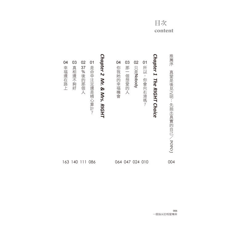 當我第一次讀到37%法則的存在時,猶如在黯淡迷惘的單身迷宮裡看到出口滲出的一絲光芒,為既孤單又焦慮的自己打了一劑強心針;然而每天工作時見到一對對不同的新人踏進工作室,上演著各式幸福戲碼,訴說著彼此獨一無二的相遇故事時,我經常忍不住想著,也許再多的機率與算計,都抵不過緣分和命運這兩個字。