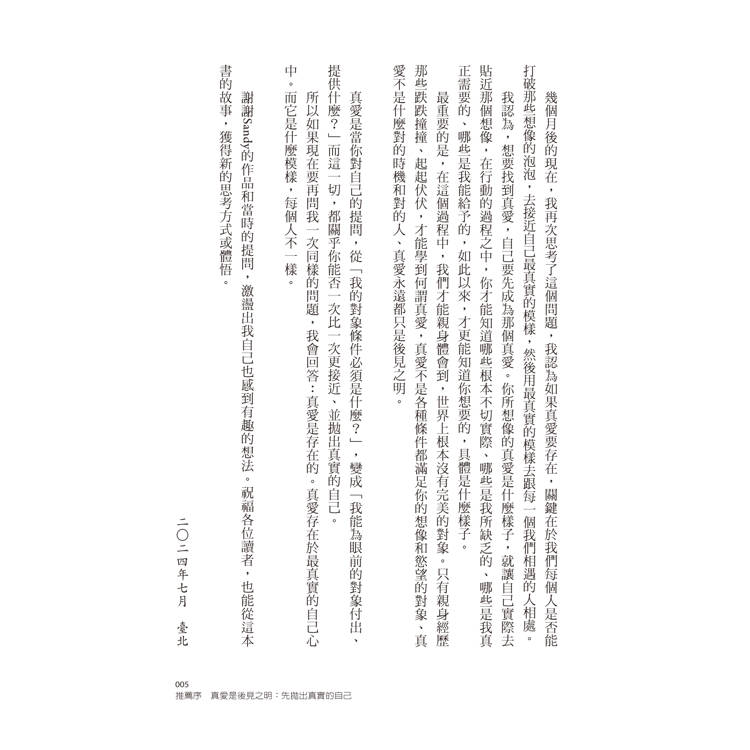 所以如果現在要再問我一次同樣的問題,我會回答:真愛是存在的。真愛存在於最真實的自己心中。而它是什麼模樣,每個人不一樣。