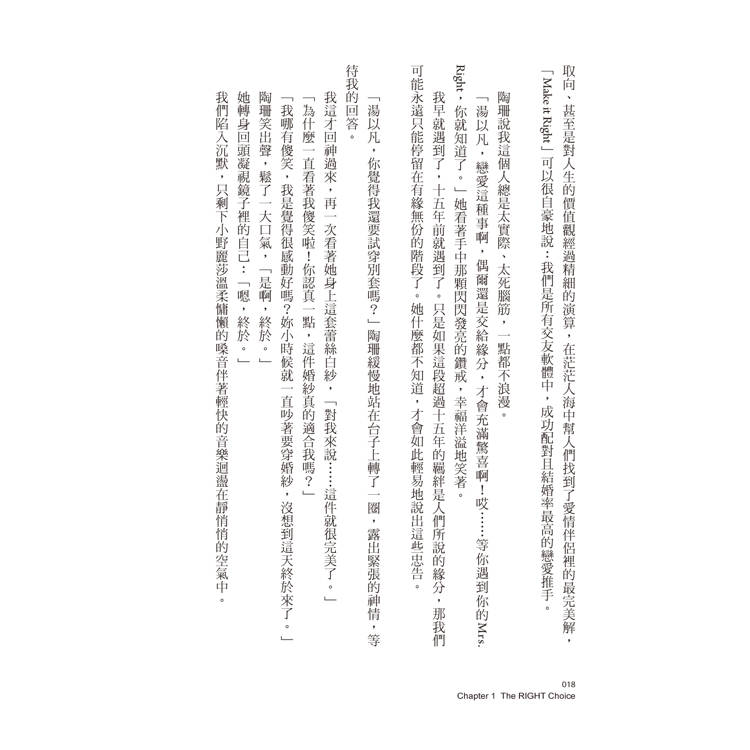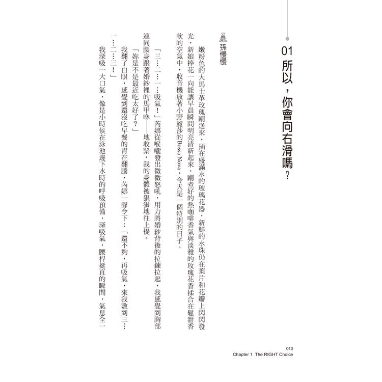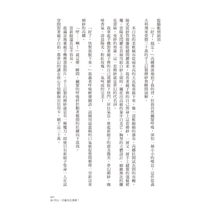 「好了,搞定。」芮娜俐落地拍了我的背,但我仍然繃緊呼吸,深怕一個小小的嘆息,這件從義大利飛來要價三十萬的手工訂製婚紗會瞬間崩解。