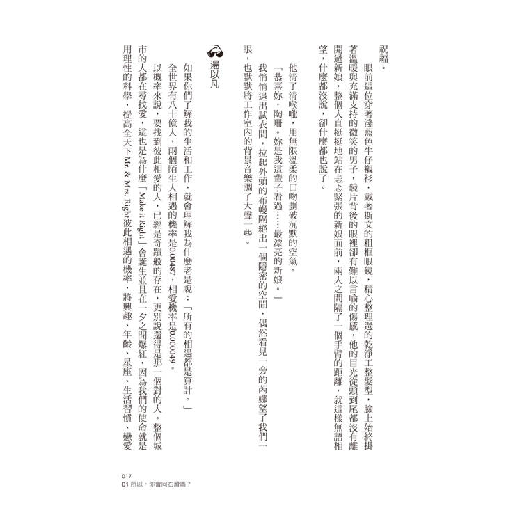 「哈哈哈哈,如果交友軟體上找天菜這麼容易,我還何苦左滑右滑。妳自己看看。」我點開手機裡的交友軟體「Make it Right」,這個占據我通勤時間、睡前抬腿和無聊寂寞時的良伴,遞給芮娜。