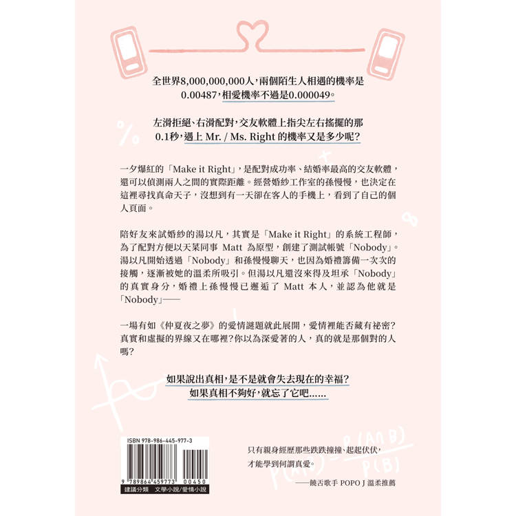 一夕爆紅的「Make it Right」,是配對成功率、結婚率最高的交友軟體,還可以偵測兩人之間的實際距離。經營婚紗工作室的孫慢慢,也決定在這裡尋找真命天子,沒想到有一天卻在客人的手機上,看到了自己的個人頁面?!