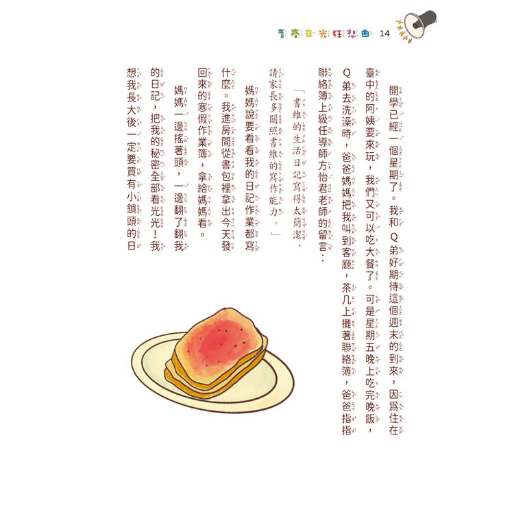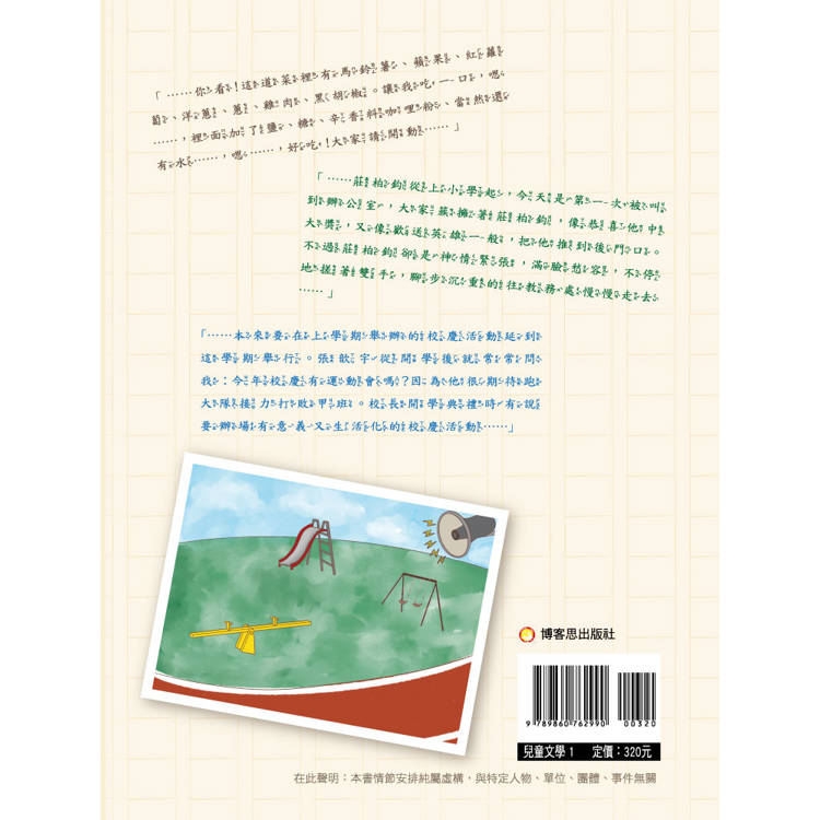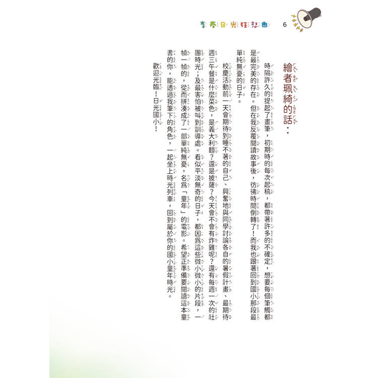 校慶活動前一天會期待到睡不著的自己、興奮地與同學討論各自的暑假計畫、最期待週三午餐是什麼菜色,是義大利麵?還是披薩?今天會不會有炸雞呢?還有每週一次的社團時光;及最害怕被叫到訓導處。看似平淡無奇的日子,都因為這些微小微小的片段,一幀一幀的,從而拼湊成了一部單純無憂,名為「童年」的電影。希望正準備要閱讀這本童書的你,能透過我筆下的角色,一起坐上時光列車,回到屬於你的國小童年時光。