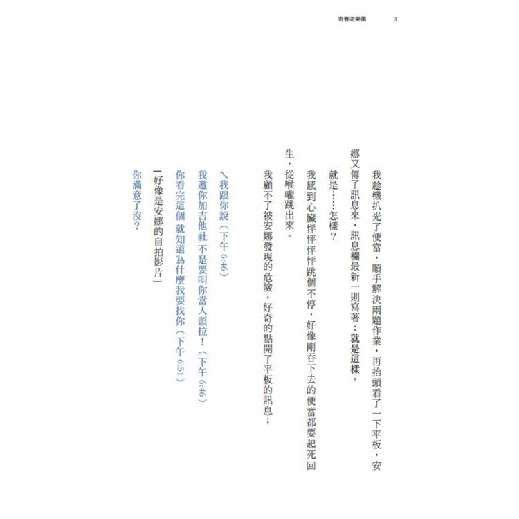 「什麼什麼?數學習作?我也要借!……欸,幹麼啦!」坐在我前面的朱彥名高興的轉過頭來,他的數學習作也是全白的。安娜見狀,粗魯的朝他的椅子踹了一腳。