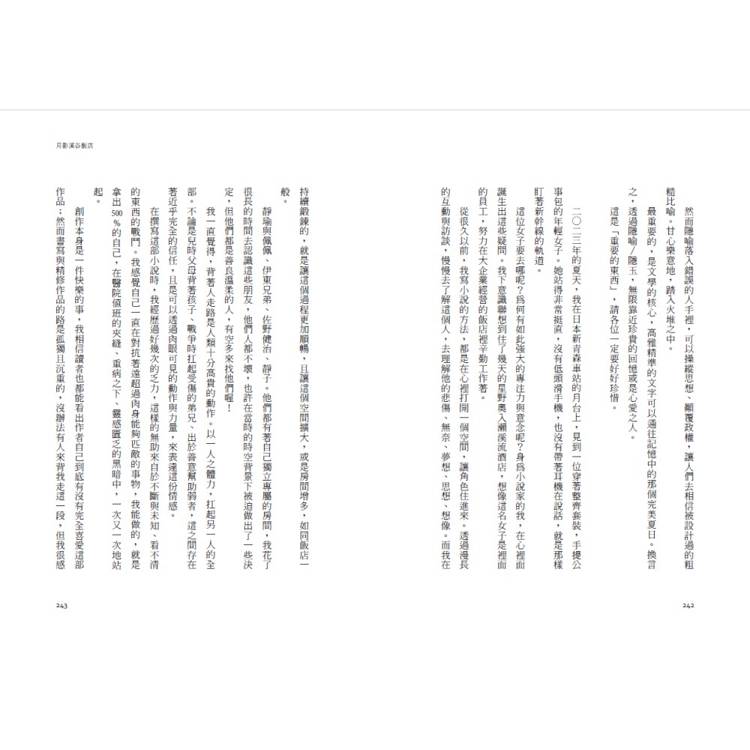 從很久以前,我寫小說的方法,都是在心裡打開一個空間,讓角色住進來。透過漫長的互動與訪談,慢慢去了解這個人,去理解他的悲傷、無奈、夢想、思想、想像。而我在持續鍛鍊的,就是讓這個過程更加順暢,且讓這個空間擴大,或是房間增多,如同飯店一般。