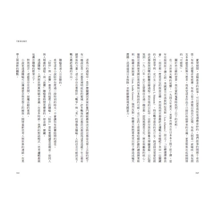 左耀元還適切援引熟悉的醫學知識,二戰時期的歷史背景,以及別有寓意的文化典故等。敘事精準,節奏明快,卻又始終保有語言文字的詩意與飽滿。引領讀者宛如身臨其境,沉浸在不斷展開、夢境般的奇幻神祕氛圍。在走向扣人心絃結局的同時,每個人彷彿也因此更靠近心愛之人與珍貴回憶一點。