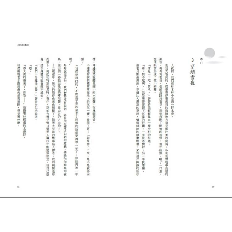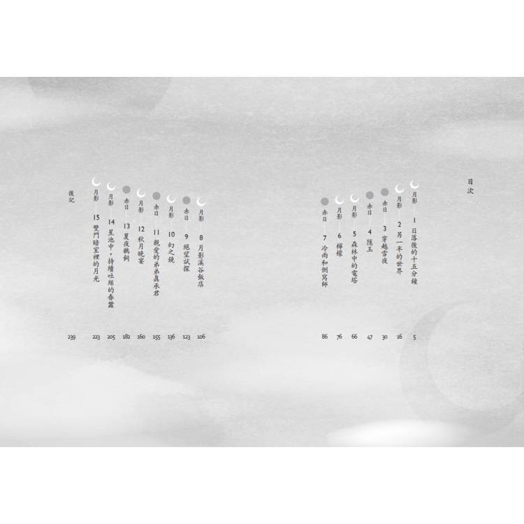融合奇幻、懸疑、冒險與深摯情感的超現實長篇小說。透過〔月影〕、〔赤日〕兩條看似平行卻又隱然交織的敘事軸線,逐步揭露連綿半世紀的祕密。