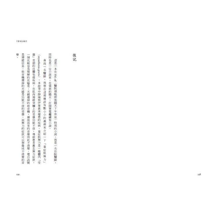 身為一名醫師,我想在這裡應該有點小小的義務來介紹一下「重症肌無力」(myasthenia gravis),本故事中靜瑜與伊東真承罹患的疾病。重症肌無力是一種體內「受器」受損的自體免疫疾病,在肌肉神經突觸上的受器功能不佳,導致患者產生無力症狀。一個比較容易理解的比喻是:天線壞掉的收音機,播放出來的音樂因此不清楚。電台訊號是神經信息,收音機壞掉的天線是功能不佳的受器,而無力的症狀可以想像成不清楚的音樂。