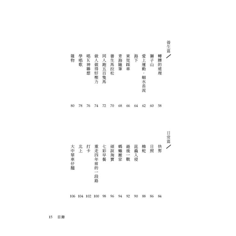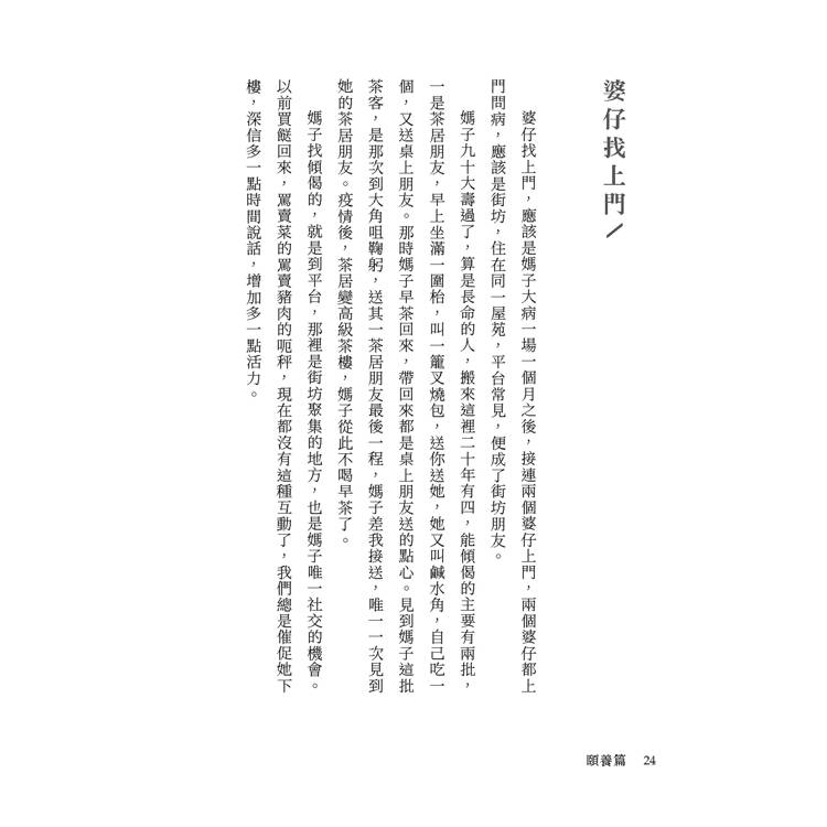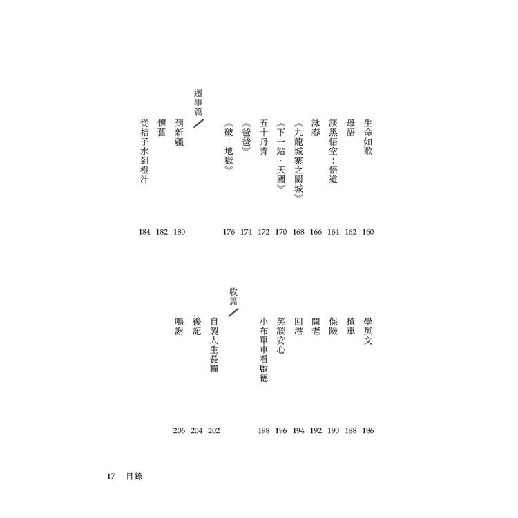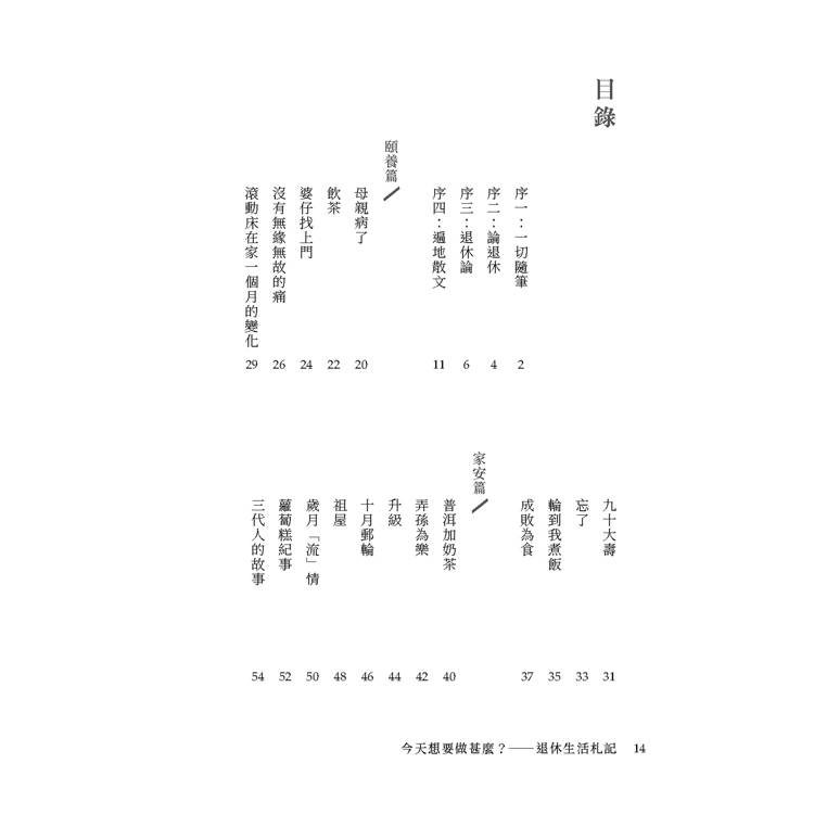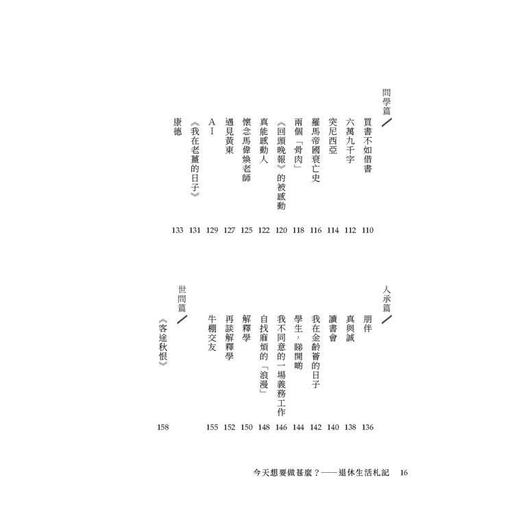 本書按作者的退休生活分成八個章節,從關注健康之本的「頤養篇」,到活到老學到老的「問學篇」,至慨歎時代變遷的「遷事篇」,一環環向我們揭示生存和生活的本質。