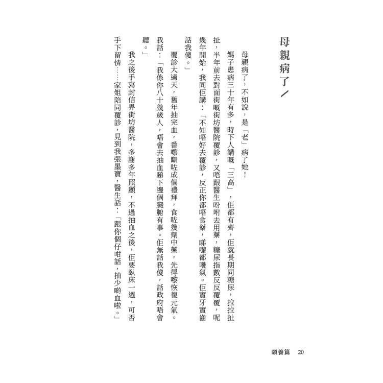 媽子患病三十年有多,時下人講嘅「三高」,佢都有齊,佢就長期同糖尿,拉拉扯扯,半年前去對面街嘅街坊醫院覆診,又唔跟醫生吩咐去用藥,糖尿指數反反覆覆,呢幾年開始,我同佢講:「不如唔好去覆診,反正你都唔食藥,睇嚟都嘥氣。佢實牙實齒話我傻。」