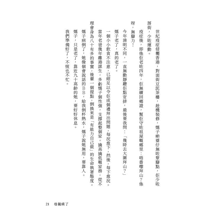 媽子病倒了,她像個會說話的BB,給我倒杯熱水,媽子說她無用,要靠人。