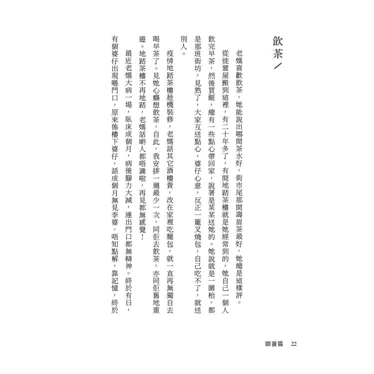 媽子九十大壽過了,算是長命的人,搬來這裡二十年有四,能傾偈的主要有兩批,一是茶居朋友,早上坐滿一圍枱,叫一籠叉燒包,送你送她,她又叫鹹水角,自己吃一個,又送桌上朋友。那時媽子早茶回來,帶回來都是桌上朋友送的點心。見到媽子這批茶客,是那次到大角咀鞠躬,送其一茶居朋友最後一程,媽子差我接送,唯一一次見到她的茶居朋友。疫情後,茶居變高級茶樓,媽子從此不喝早茶了。