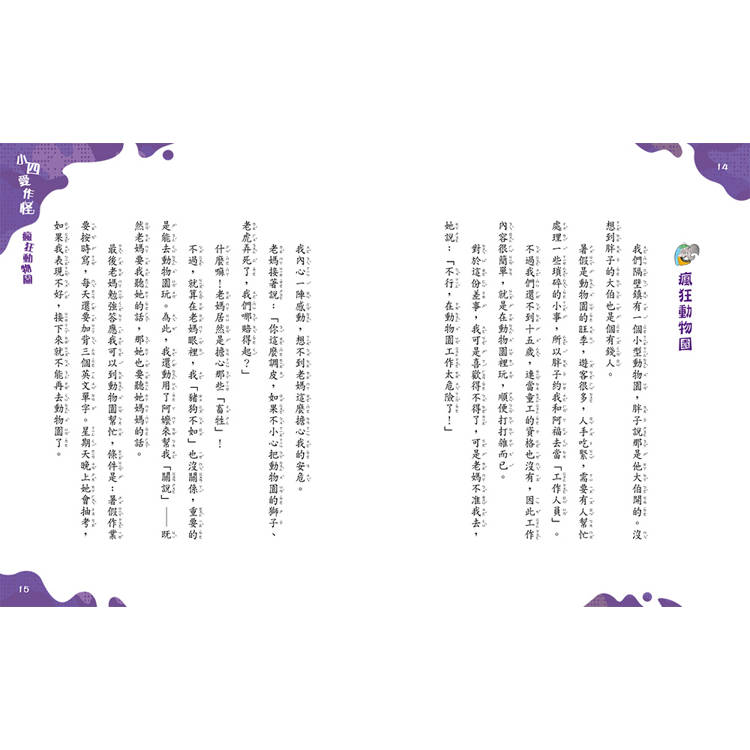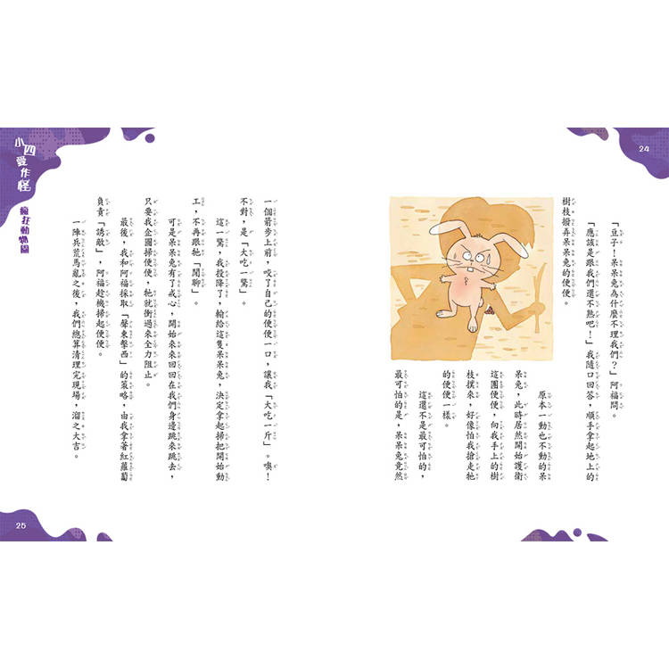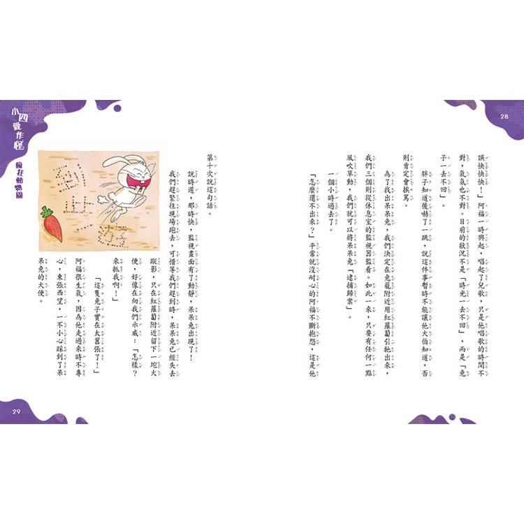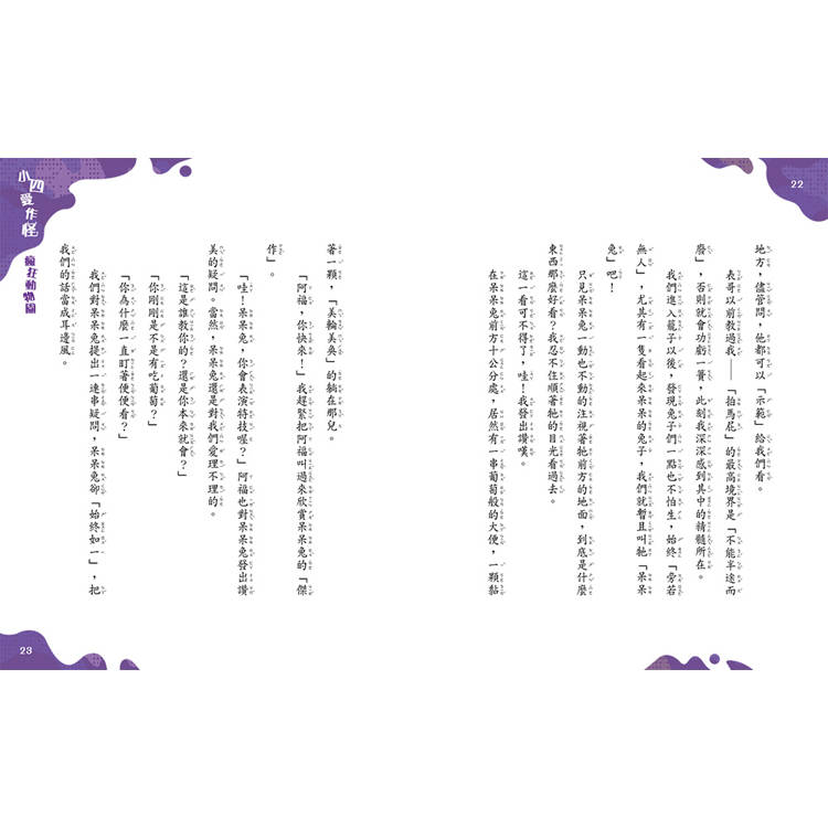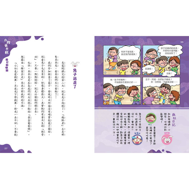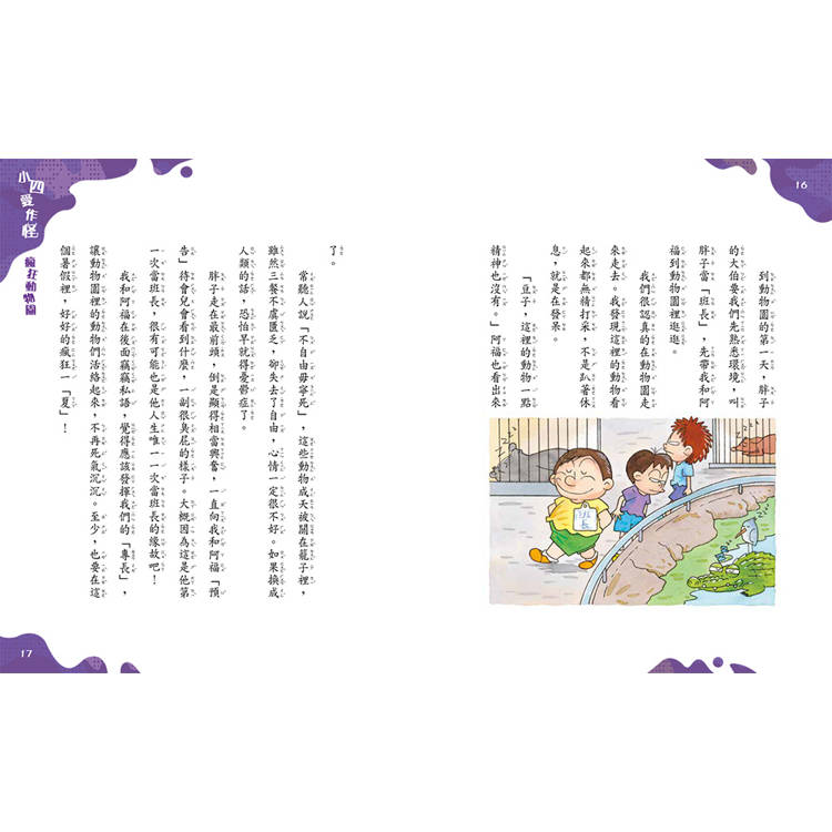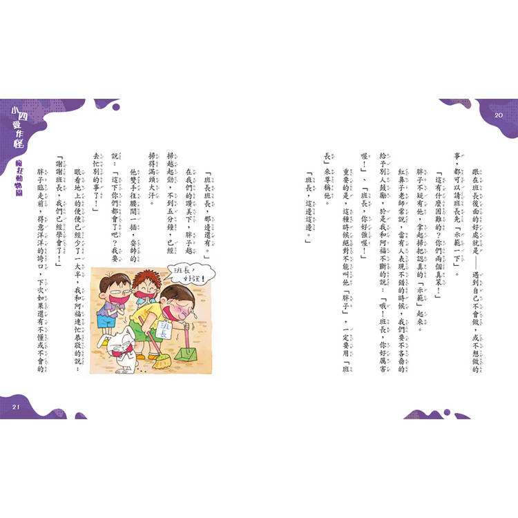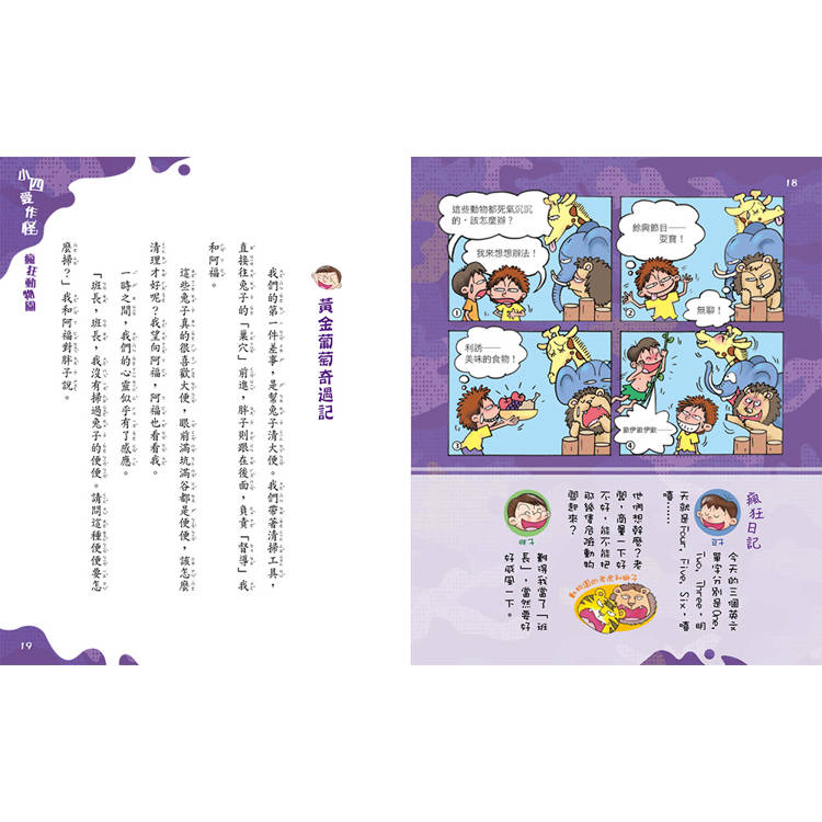 【小四愛作怪】系列以由一群四年級孩子領銜主演。每本書的內容各成一個主題,以短篇章節呈現,每篇都有一幅爆笑的四格漫畫吸引讀者進入閱讀。在趣味無窮的閱讀中,引領孩子認識孔孟思想、三國演義、二十四孝、增進生態知識,並且學習與同儕相處、生命教育等人生議題!