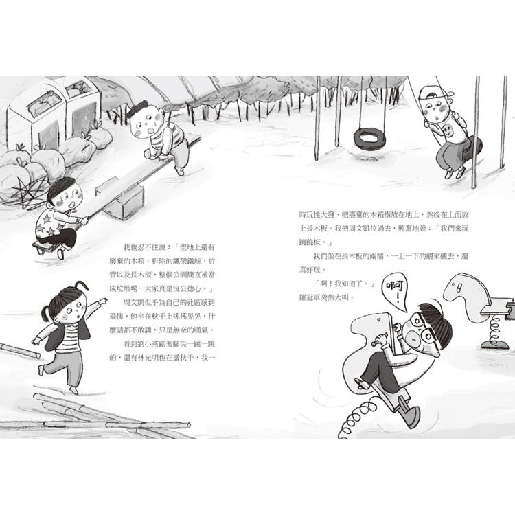 這時,劉小燕從周文凱旁邊出現,義憤填膺地說:「我剛好經過,都聽見了。這些大人隨便誣賴小孩子,真討厭。我們年紀雖然小,卻比他們有公德心。」