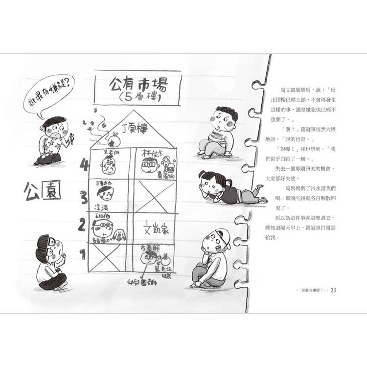 「事情發生在三天前。」周文凱眼珠子轉呀轉,慢慢地說:「我們家頂樓是開放的公共空間,不過我家公寓旁邊就是公園,大家平常都在公園活動,很少上去頂樓,只有住在四樓的呂老伯會天天上去曬太陽,打太極拳。」