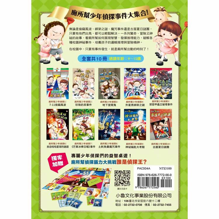 小魯行動俱樂部《我最愛的廁所幫:十大神祕案件》強勢登場!完整收錄《廁所幫少年偵探》系列,全套共十冊,讓您一次擁有最驚奇、最冒險、最機智的「廁所幫」!