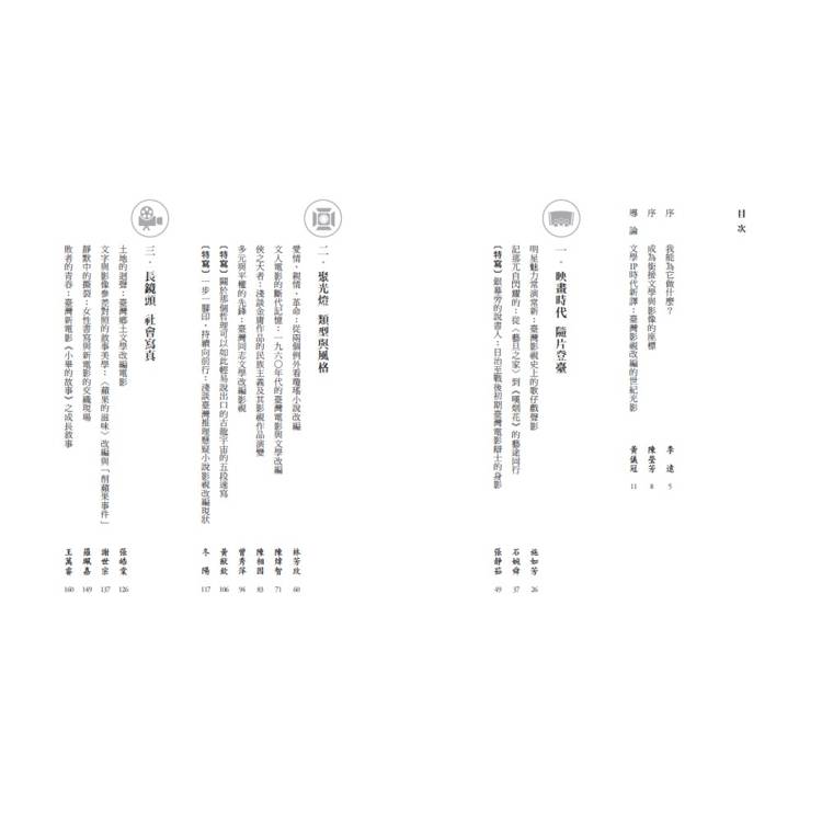 本書即以臺灣文學改編影視作為核心,以時代為經緯,鏡頭美學為探照燈,設計四個單元:「一・映畫時代 隨片登臺」講述日治到戰後初期電影與文學的合作。「二・聚光燈 類型與風格」將聚光燈打在類型作品的改編。「三・長鏡頭 社會寫真」綜論新電影時期所引領的寫實美學與社會關懷。「四・場面調度 多元轉譯」則將目光轉向現當代文學劇、單元劇及作家紀錄片。「特寫」單元則聚焦在作家與導演現身說法,以及專業讀者與資深影迷的深情告白。