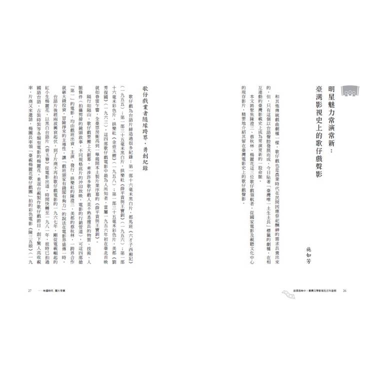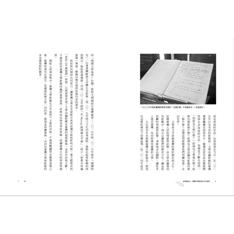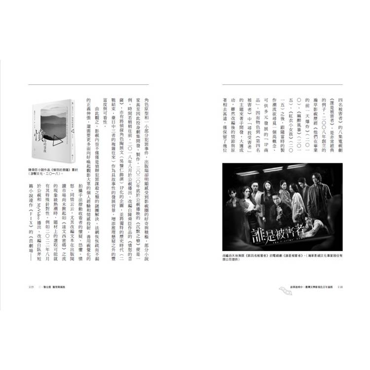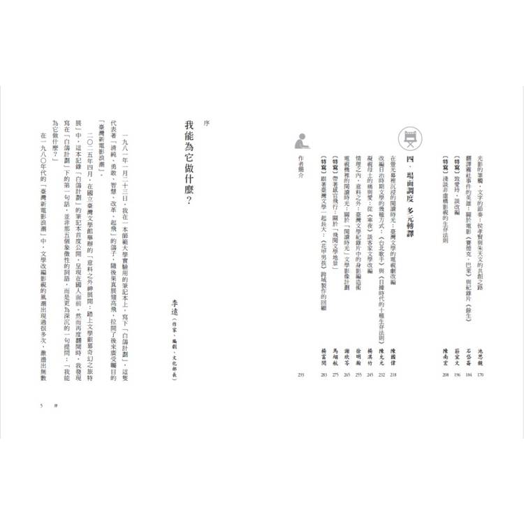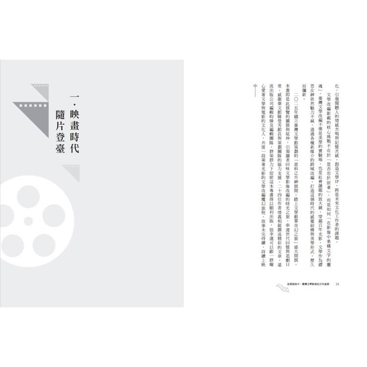 搭配若干原著書封、珍藏史料與影視海報劇照等,展現臺灣故事如何被轉譯、傳播並相承的世紀光影紀事,值得文學與影視讀者觀眾、研究評論人、產業工作者閱讀參考。