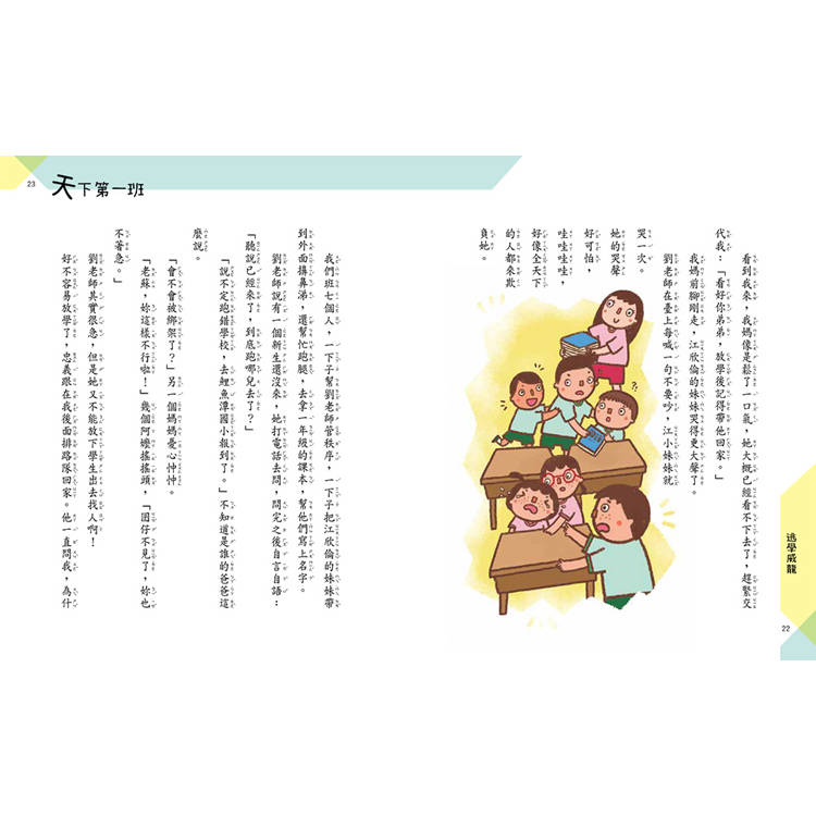 金鼎獎作家王文華經典校園故事,記錄當年的他在一所迷你小學,帶領一個迷你班級的故事。那是天下第一班——第一愛說話的班,他們總共只有八個人,可是每一個都超愛講話,不但吱吱喳喳,意見超級多,還常常逃課去釣魚,踢球進菜圃,放狗追老師,狀況百出,天天都有人上門來告狀……雖然老師為了教好這群孩子而傷透腦筋,但事實上,這些孩子也把老師看成他們應該照顧的對象——為老師緊張,為老師作媒,為老師擔心。故事裡濃濃的師生之愛、同儕之情,繪出一幅最美麗的校園風景。