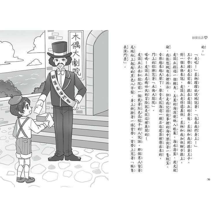 皮諾丘停下腳步,環顧著四周。一群揹著背包的小孩經過,他就跟著他們走。他們一定也是要去上學。