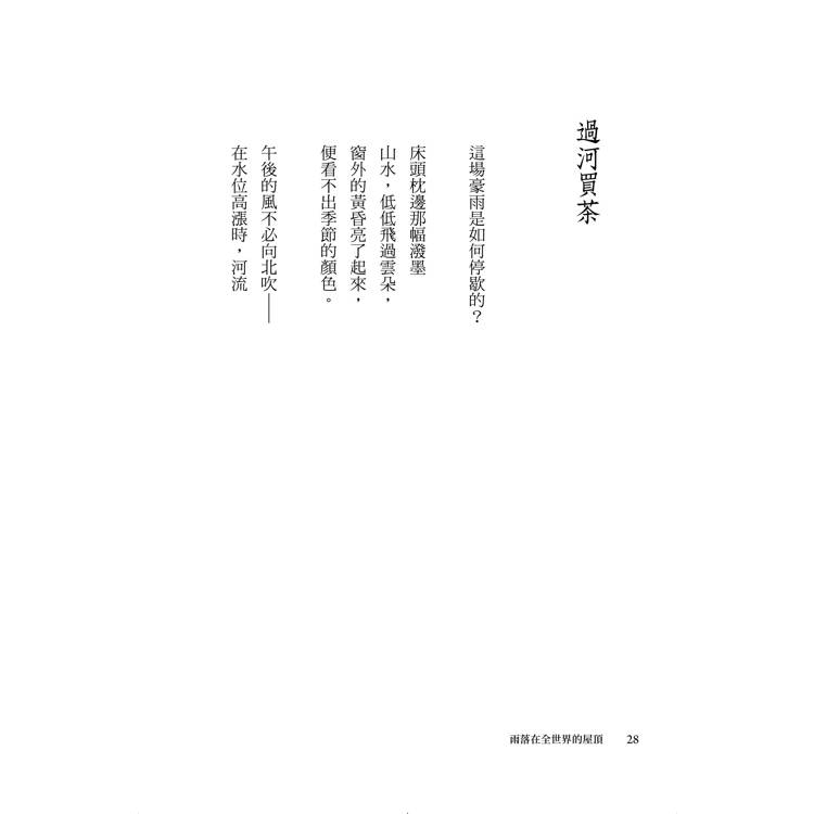 這回紀念新版,全書六輯輯名不變,即「過河買茶」、「香格里拉」、「菊花院」、「穿過鐘聲」、「劇場」、「不知名的航行」;詩作過濾後,增九減六,計得六十二首。詩集同名詩〈雨落在全世界的屋頂〉是序詩,也重複收錄在第三輯中。在此提供了兩種版本,內文的雨詩為原作,序詩則微調了兩個意象──「清醒得像京城裡最高的那片飛簷」/「清醒得像港都裡最高的那片飛簷」;「清醒得像黃河河床最古老的那塊石頭」/「清醒得像基隆河河床最古老的那塊石頭」。京城、黃河是屬於歷史的、血緣的;港都、基隆河是屬於地理的、現實的──如此並置,差堪隱合台灣當前境況。