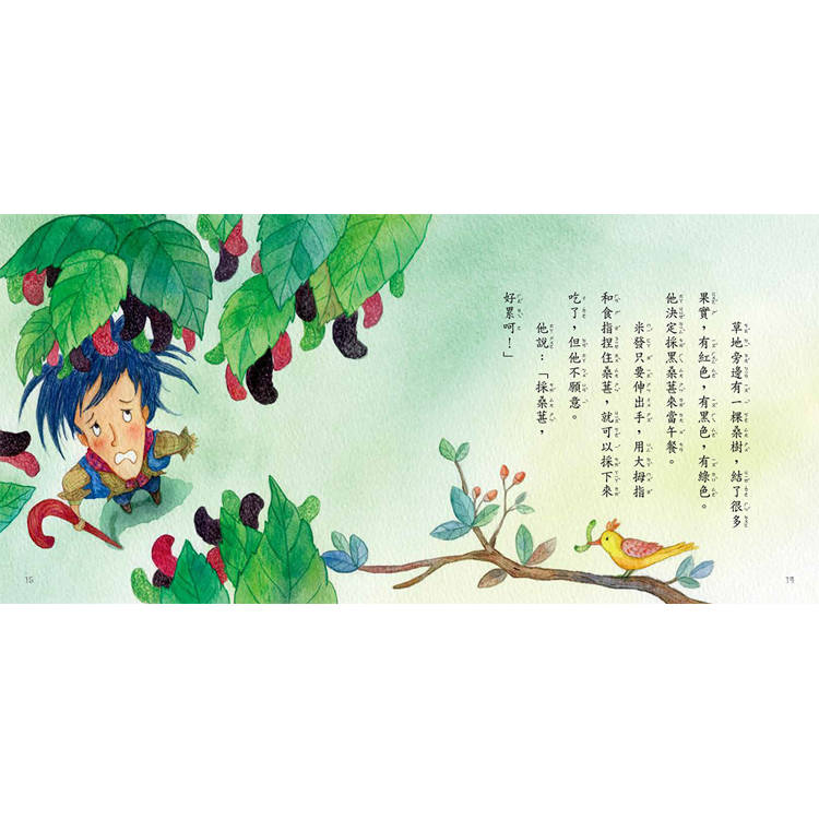 草地旁邊有一棵桑樹,結了很多果實,有紅色,有黑色,有綠色。他決定採黑桑葚來當午餐。